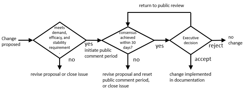 - Reject the proposal. The decision will be recorded in the decision history and no changes will be made in the documentation.