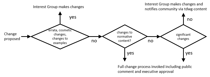 Because non-normative content provides only supplemental information, the Interest Group may use its discretion to decide the extent to which the community should be involved in implementing changes to non-normative content. For example, relatively cosmetic changes, such as improving figures, changing formatting, minor improvements to examples, etc. can be made without triggering any change process or notification via the TDWG email list [TDWG-CONTENT]. More significant changes or improvements to non-normative content may warrant notification of the community via the TDWG email list [TDWG-CONTENT]. If the Interest Group determines that proposed changes to non-normative content are significant enough, it may chose to invoke the full change process. Substantive changes to non-normative content will usually trigger a version change for the affected document.